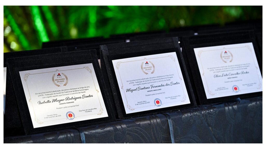 Durante a solenidade, os atletas homenageados receberam placas comemorativas e certificados, símbolos que registram oficialmente o desempenho e o mérito alcançados na temporada. Mais do que premiações, os reconhecimentos reforçaram a importância do comprometimento contínuo com os valores do Karatê-Dô Tradicional, como respeito, perseverança e superação.